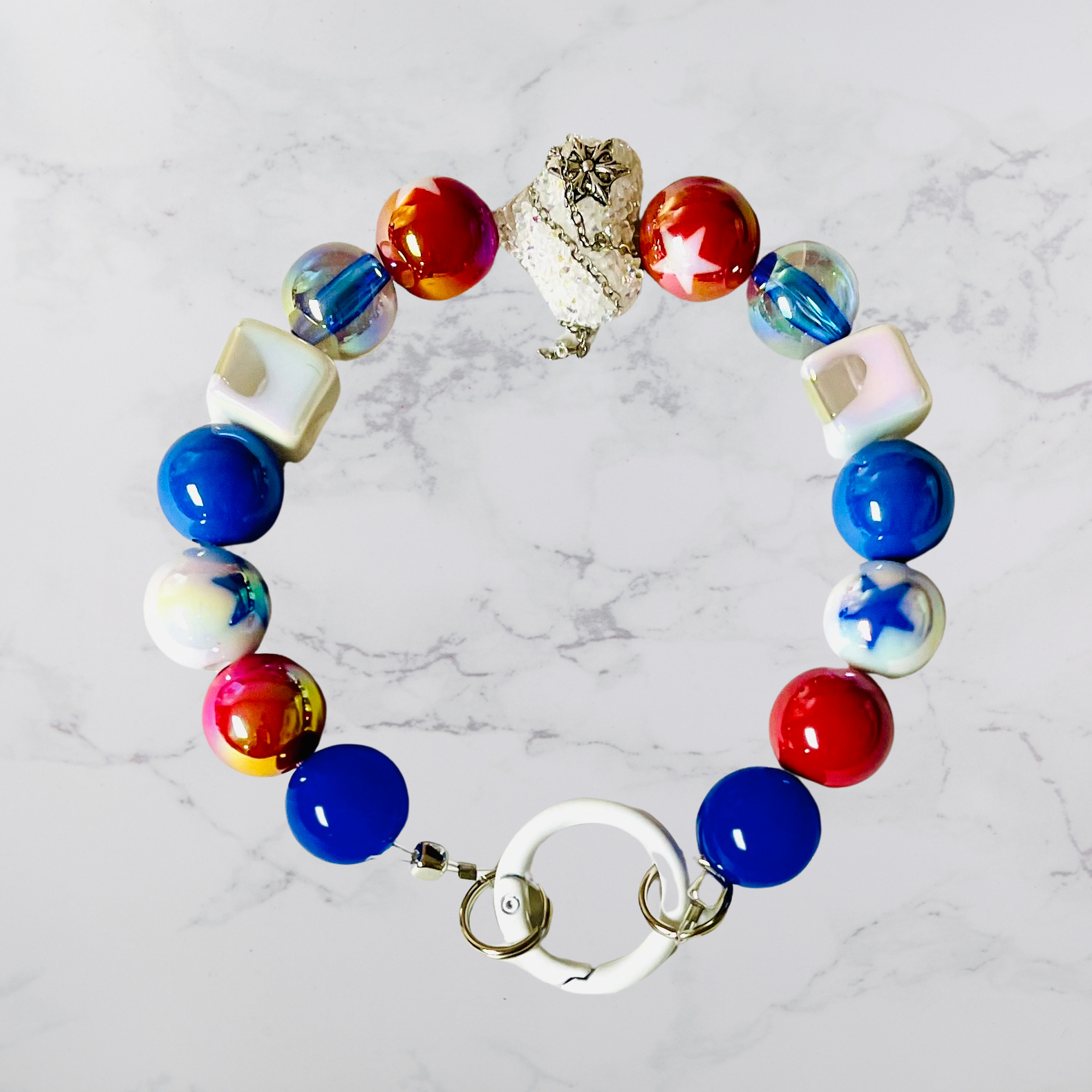 Celebrate your patriotism with the Stars & Stripes Wristlet Key Ring! This stylish and functional accessory features a mix of 15mm acrylic beads in vibrant red, white, and blue. Perfect for securing your keys with flair, the wristlet design allows for easy carrying while showcasing your love for the American flag. Ideal for everyday use or special occasions like Independence Day, this key ring adds a touch of patriotic pride to your essentials. Embrace the spirit of freedom and style with the Stars & Stripes Wristlet Key Ring!