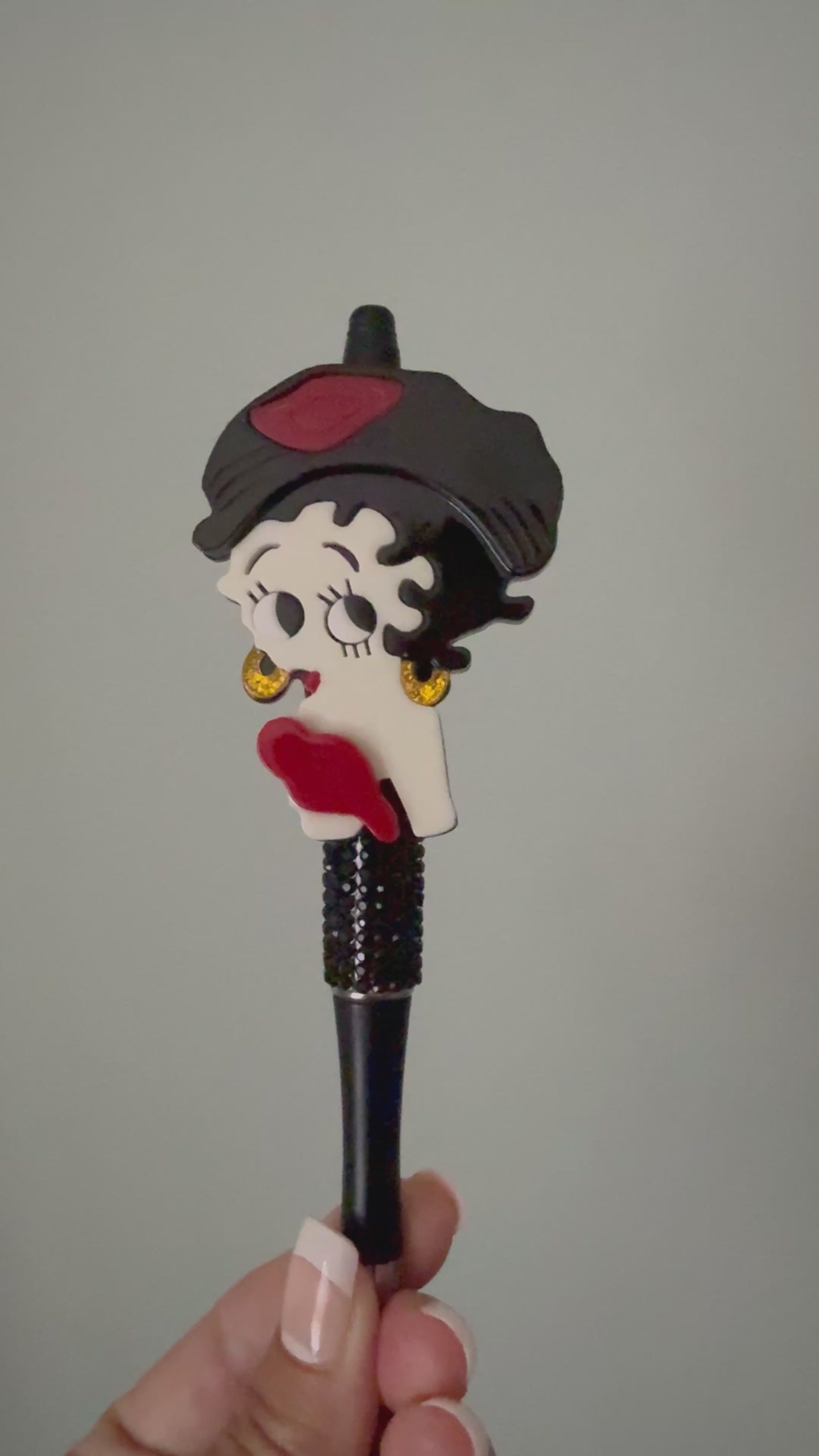 With her signature red beret, gold earrings, and a flirty expression on the front—and a dazzling red gem heart on the back—this pen is full of character from every angle. The grip is wrapped in shimmering black rhinestones, making it as functional as it is fabulous.