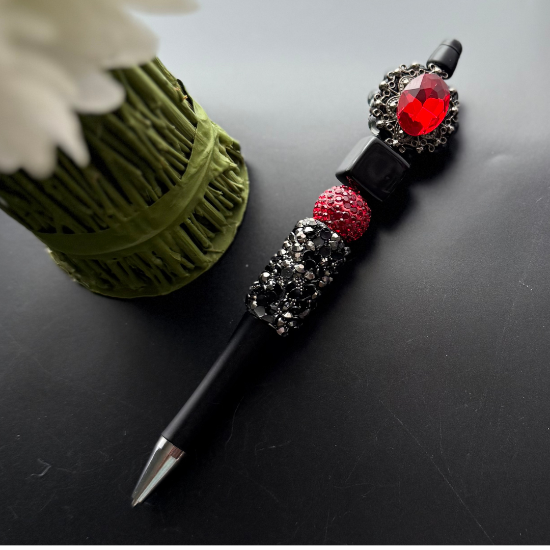 A bold statement piece, this beaded pen is draped in ruby red and jet black crystals. A brilliant red gem focal bead steals the show. Perfect for boss babes and bold dreamers.