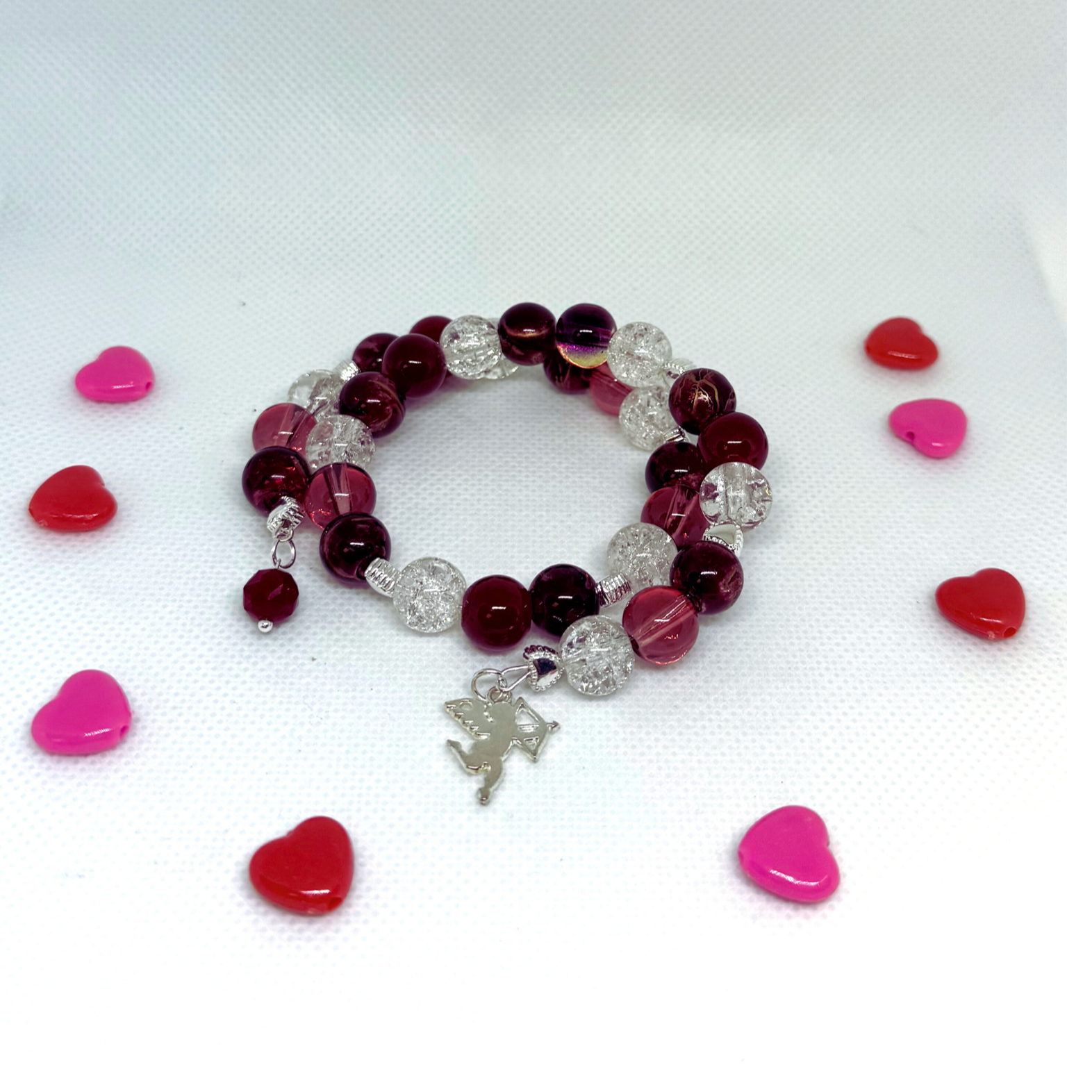 Add a touch of romance to your style with this stunning memory wire bracelet. Featuring vibrant multi-color red glass beads and a shimmering crackle finish, this piece is a radiant celebration of love. The charming cupid charm adds a playful, romantic detail, making it perfect for Valentine's Day or any occasion to show your heart.