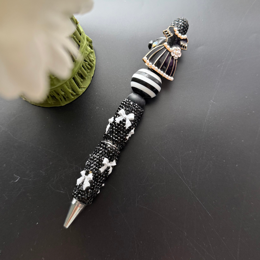 Sophisticated and fun, this black-and-white beaded pen features a chic little poodle charm in a pearl-trimmed dress. It’s French-inspired glam with a playful twist.