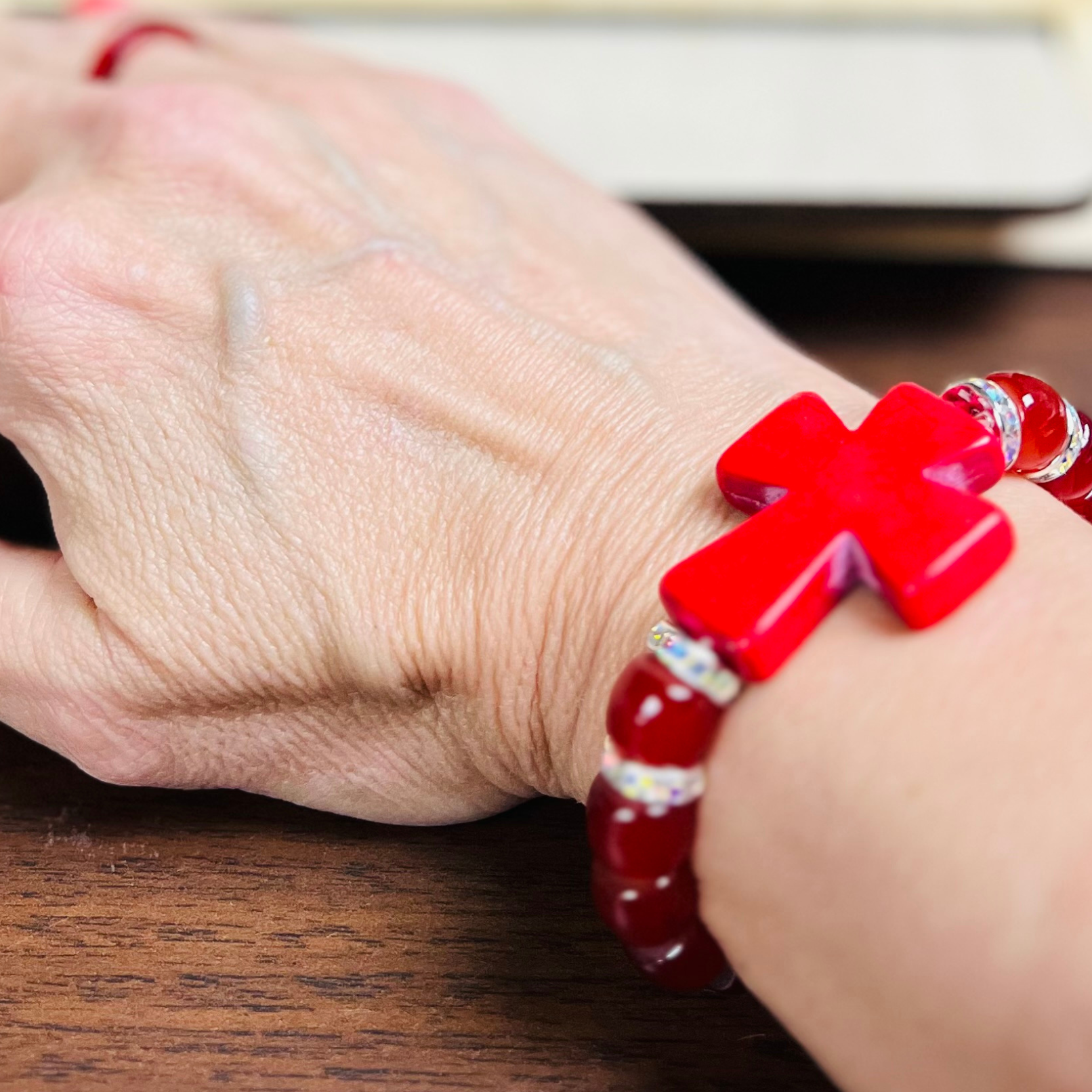 This elegant bracelet features a stunning array of glass beads complemented by sparkling rondel spacers, creating a sophisticated and eye-catching accessory. The bracelet measures 7 1/8" in length, with the dyed composite stone cross bead measuring 30 mm in width. Due to the assorted nature of this stone, the unique variations in color and size yield a one-of-a-kind piece, making each bracelet truly unique. Please note that the color may vary.